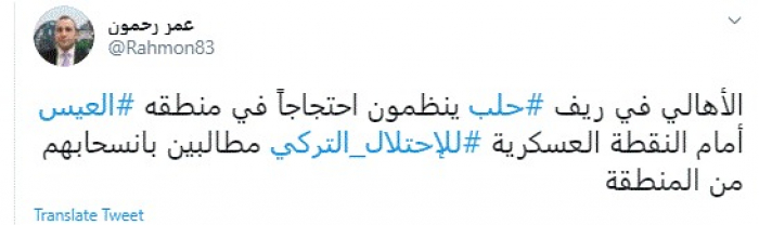 وقال في تغريدة عبر "تويتر" رصدها "المشهد العربي": "الأهالي في ريف حلب ينظمون احتجاجاً في منطقه العيس أمام النقطة العسكرية للاحتلال التركي مطالبين بانسحابهم من المنطقة".