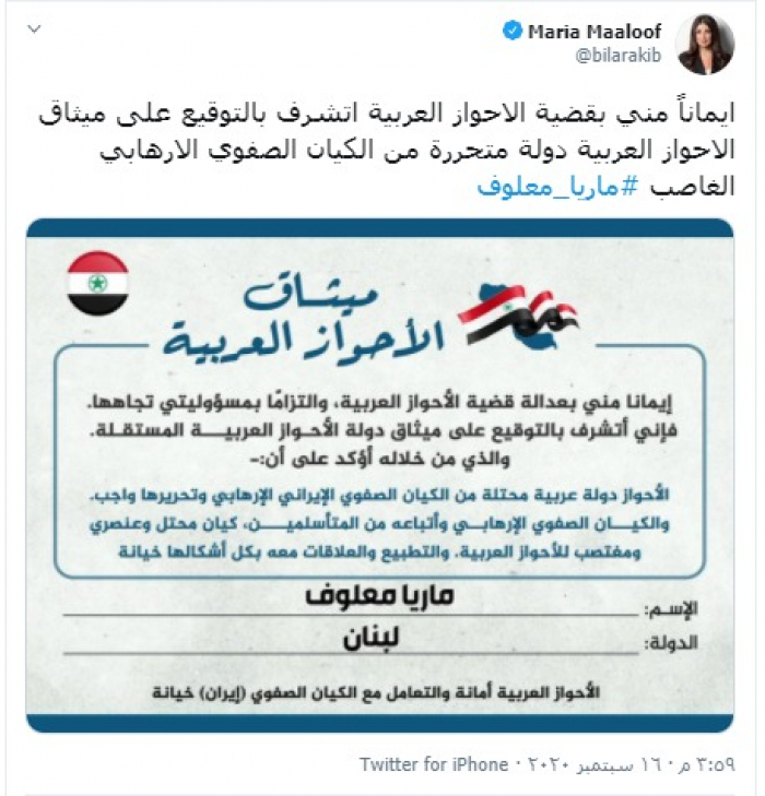وكتبت "معلوف" في تغريدة بتويتر، رصدها "المشهد العربي": "إيماناً مني بقضية الأحواز العربية اتشرف بالتوقيع على ميثاق الأحواز العربية دولة متحررة من الكيان الصفوي الإرهابي الغاصب".