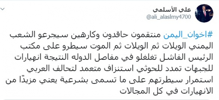 وكتب عبر تغريدة له على "تويتر" رصدها " المشهد العربي": "إخوان اليمن منتقمون حاقدون وكارهين سيجرعوا الشعب اليمني الويلات ثم الويلات ثم الموت سيطروا على مكتب الرئيس الفاشل تغلغلوا في مفاصل الدولة، النتيجة انهيارات للجبهات، تمدد للحوثي استنزاف متعمد للتحالف العربي، استمرار سيطرتهم على ما تسمى بشرعية يعني مزيدًا من الانهيارات في كل المجالات".