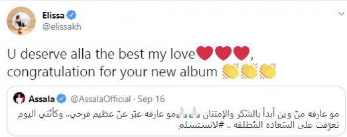 وكتبت إليسا عبر حسابها الرسمي بموقع تويتر: "أنتِ تستحقين كل الأفضل يا حبيبتي .. مبروك على ألبومك الجديد".