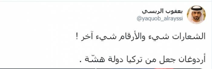 قال الكاتب الإماراتي يعقوب الريسي، اليوم الخميس، أن رئيس النظام التركي رجب طيب أردوغان جعل من تركيا دولة ضعيفة وهشة.