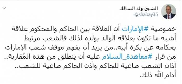 وكتب عبر تغريدة له على "تويتر" رصدها " المشهد العربي": "خصوصية الإمارات أن العلاقة بين الحاكم والمحكوم علاقة أشبه ما تكون بعلاقة الوالد بولده لذلك فالشعب مرتبط بحكامه عن بكرة أبيه، من يريد أن يفهم موقف شعب الإمارات من قرار معاهدة السلام عليه أن ينطلق من هذه المُقاربة، آذان الشعب صاغية للحاكم وأذن الحاكم صاغية للشعب، أدام الله ذلك".