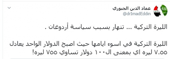 أكد المحلل السياسي العراقي عماد الدين الجبوري، اليوم الخميس، أن الليرة التركية تنهار بسبب سياسة أردوغان الفاشلة.