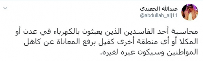 وكتب عبر تغريدة له على "تويتر" رصدها " المشهد العربي": "محاسبة أحد الفاسدين الذين يعبثون بالكهرباء في عدن أو المكلا أو أي منطقة أخرى كفيل برفع المعاناة عن كاهل المواطنين وسيكون عبره لغيره".