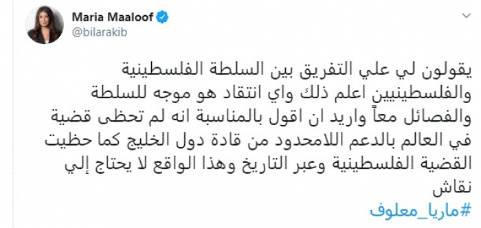وكتبت في تغريدة عبر "تويتر" رصدها "المشهد العربي": "يقولون لي علي التفريق بين السلطة الفلسطينية والفلسطينيين أعلم ذلك وأي انتقاد هو موجه للسلطة والفصائل معاً".