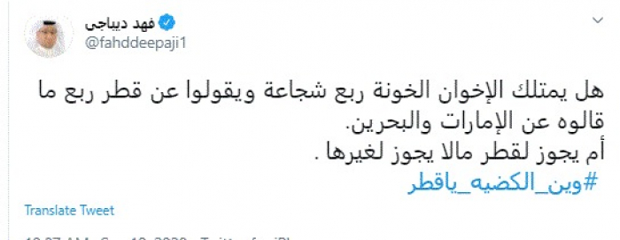 وقال في تغريدة عبر "تويتر" رصدها "المشهد العربي": "هل يمتلك الإخوان الخونة ربع شجاعة ويقولوا عن قطر ربع ما قالوه عن الإمارات والبحرين. أم يجوز لقطر مالا يجوز لغيرها".
