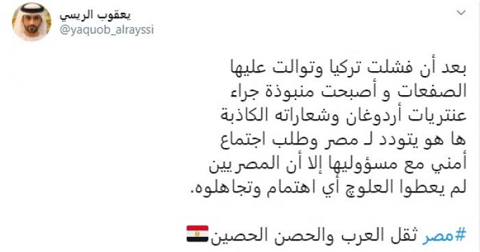 علق الكاتب الإماراتي يعقوب الريسي، اليوم، على طلب الرئيس التركي رجب طيب أردوغان بالحوار مع مصر.