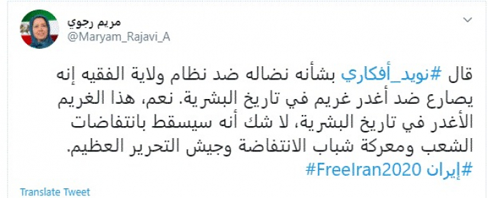 وكتبت في تغريدة عبر "تويتر" رصدها "المشهد العربي": "قال نويد أفكاري بشأنه نضاله ضد نظام ولاية الفقيه إنه يصارع ضد أغدر غريم في تاريخ البشرية. نعم، هذا الغريم الأغدر في تاريخ البشرية، لا شك أنه سيسقط بانتفاضات الشعب ومعركة شباب الانتفاضة وجيش التحرير العظيم".