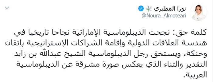وكتبت عبر تغريدة لها على "تويتر" رصدها " المشهد العربي": "كلمة حق، نجحت الديبلوماسية الإماراتية نجاحا تاريخيا في هندسة العلاقات الدولية وإقامة الشراكات الاستراتيجية بإتقان وحنكة، ويستحق رجل الديبلوماسية الشيخ عبدالله بن زايد التقدير والثناء الذي يعكس صورة مشرقة عن الديبلوماسية العربية".