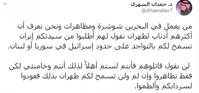 وكتب عبر تغريدة له على "تويتر" رصدها " المشهد العربي": "من يعمل في البحرين شوشرة ومظاهرات ونحن نعرف أن أكثرهم أذناب لطهران نقول لهم أطلبوا من سيدتكم إيران تسمح لكم بالتواجد على حدود إسرائيل في سوريا أو لبنان، لن نقول قاتلوهم فأنتم لستم أهلاً لذلك أنتم وخامنئي لكن فقط تظاهروا وإن لم ولن تسمح لكم طهران بذلك فعودوا لسردابكم وألطموا".