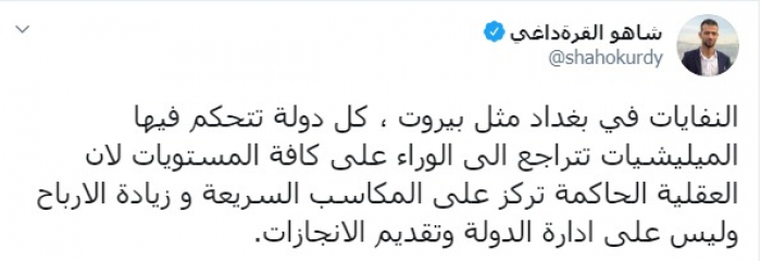 وكتب عبر تغريدة له على "تويتر" رصدها " المشهد العربي": "النفايات في بغداد مثل بيروت ، كل دولة تتحكم فيها الميليشيات تتراجع إلى الوراء على كافة المستويات لأن العقلية الحاكمة تركز على المكاسب السريعة و زيادة الأرباح وليس على إدارة الدولة وتقديم الإنجازات".