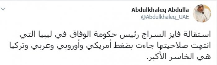 وكتب عبر تغريدة له على "تويتر" رصدها " المشهد العربي": "استقالة فايز السراج رئيس حكومة الوفاق في ليبيا التي انتهت صلاحيتها جاءت بضغط أمريكي وأوروبي وعربي وتركيا هي الخاسر الأكبر".