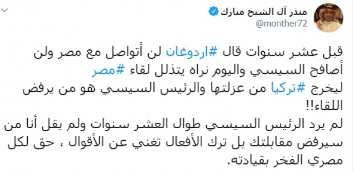 وكتب عبر تغريدة له على "تويتر" رصدها " المشهد العربي": "قبل عشر سنوات قال أردوغان لن أتواصل مع مصر ولن أصافح السيسي واليوم نراه يتذلل للقاء مصر، ليخرج تركيا من عزلتها والرئيس السيسي هو من يرفض اللقاء".