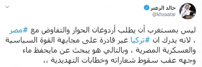 وكتب عبر تغريدة له على "تويتر" رصدها " المشهد العربي": "ليس بمستغرب أن يطلب أردوغان الحوار والتفاوض مع مصر، لأنه يدرك أن تركيا غير قادرة على مجابهة القوة السياسية والعسكرية المصرية ، وبالتالي هو يبحث عن ما يحفظ ماء وجهه عقب سقوط شعاراته وخطابات التهديدية".