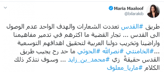 وكتبت عبر تغريدة لها على "تويتر" رصدها " المشهد العربي":"طريق القدس تعددت الشعارات والهدف الواحد عدم الوصول إلى القدس، تجار القضية ما أكثرهم في تدمير مفاهيمنا وأراضينا وتخريب دولنا العربية لتحقيق أهدافهم التوسعية، الخامنئي، نصرالله، الحوثي، ما حد رح يجيب طريق القدس حقيقةً زي محمد بن زايد، وسوف نتذكر ذلك الكلام".