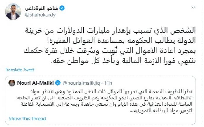 وقال في تغريدة عبر "تويتر" رصدها "المشهد العربي": "الشخص الذي تسبب بإهدار مليارات الدولارات من خزينة الدولة يطالب الحكومة بمساعدة العوائل الفقيرة".