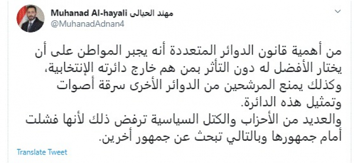 وقال في تغريدة عبر "تويتر" رصدها "المشهد العربي": "من أهمية قانون الدوائر المتعددة أنه يجبر المواطن على أن يختار الأفضل له دون التأثر بمن هم خارج دائرته الإنتخابية، وكذلك يمنع المرشحين من الدوائر الأخرى سرقة أصوات وتمثيل هذه الدائرة".