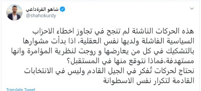 قال الكاتب الصحفي العراقي شاهو القرةداغي، اليوم، إن العراق يحتاج لحركات سياسية تفكر في الجيل القادم وليس في الانتخابات المقبلة.