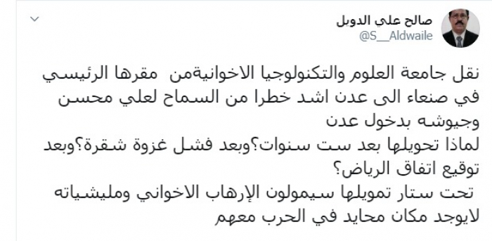 الدويل يحذر من نقل جامعة إخوانية من صنعاء إلى العاصمة عدن
