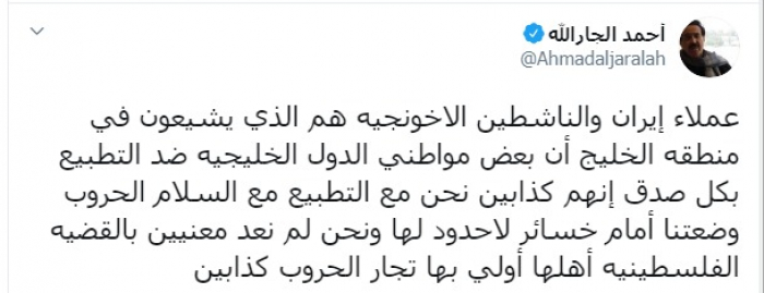 وكتب عبر تغريدة له على "تويتر" رصدها " المشهد العربي": "عملاء إيران والناشطين الإخونجية هم الذي يشيعون في منطقه الخليج أن بعض مواطني الدول الخليجية ضد التطبيع، بكل صدق إنهم كذابين نحن مع التطبيع مع السلام، الحروب وضعتنا أمام خسائر لا حدود لها، ونحن لم نعد معنيين بالقضية الفلسطينية أهلها أولي بها تجار الحروب كذابين".
