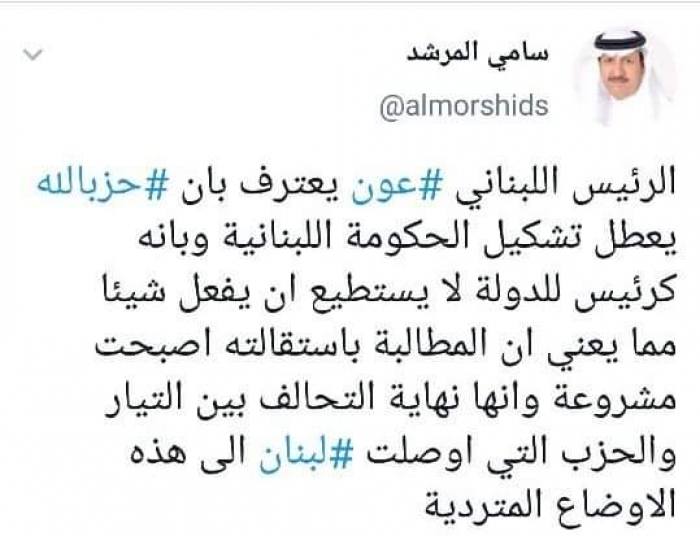 وقال في تغريدة عبر "تويتر" رصدها "المشهد العربي": "الرئيس اللبناني عون يعترف بأن حزبالله يعطل تشكيل الحكومة اللبنانية وبأنه كرئيس للدولة لا يستطيع أن يفعل شيئا مما يعني أن المطالبة باستقالته اصبحت مشروعة وأنها نهاية التحالف بين التيار والحزب التي أوصلت لبنان الى هذه الأوضاع المتردية".