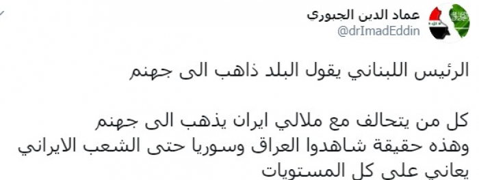 وكتب عبر تغريدة له على "تويتر" رصدها " المشهد العربي": "الرئيس اللبناني يقول البلد ذاهب إلى جهنم، كل من يتحالف مع ملالي إيران يذهب إلى جهنم، وهذه حقيقة شاهدوا العراق وسوريا حتى الشعب الإيراني يعاني على كل المستويات".