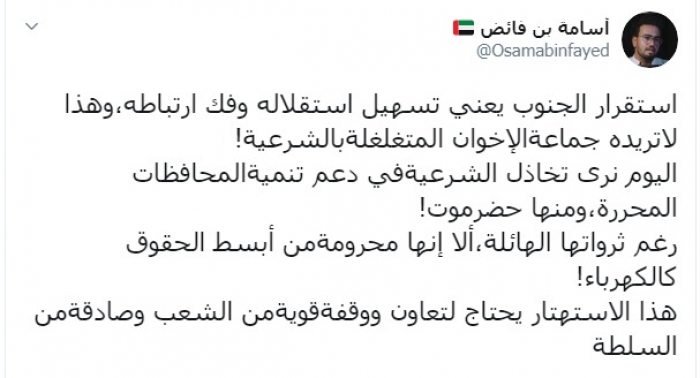 وكتب عبر تغريدة له على "تويتر" رصدها " المشهد العربي": "استقرار الجنوب يعني تسهيل استقلاله وفك ارتباطه، وهذا لا تريده جماعة الإخوان المتغلغلة بالشرعية، اليوم نرى تخاذل الشرعية في دعم تنمية المحافظات المحررة، ومنها حضرموت، رغم ثرواتها الهائلة، إلا أنها محرومة من أبسط الحقوق كالكهرباء، هذا الاستهتار يحتاج لتعاون ووقفة قوية من الشعب وصادقة من السلطة".