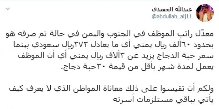 وكتب عبر تغريدة له على "تويتر" رصدها " المشهد العربي": "معدّل راتب الموظف في الجنوب واليمن في حالة تم صرفه هو بحدود ٦٠ألف ريال يمني أي ما يعادل ٢٧٢ريال سعودي بينما سعر حبة الدجاج يزيد عن ٣آلاف ريال يمني أي أن الموظف يعمل لمدة شهر بأقل من قيمة ٢٠حبة دجاج، ولكم أن تقيسوا على ذلك معاناة المواطن الذي لا يعرف كيف يأتي بباقي مستلزمات أسرته".