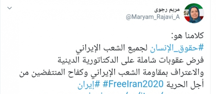 وكتبت عبر تغريدة لها على "تويتر" رصدها "المشهد العربي": "كلامنا هو، حقوق الإنسان لجميع الشعب الإيراني، فرض عقوبات شاملة على الدكتاتورية الدينية،والاعتراف بمقاومة الشعب الإيراني وکفاح المنتفضين من أجل الحرية".