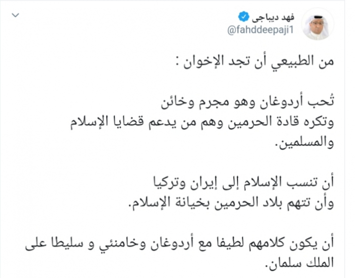 وكتب عبر تغريدة له على "تويتر" رصدها "المشهد العربي":"من الطبيعي أن تجد الإخوان، تُحب أردوغان وهو مجرم وخائن، وتكره قادة الحرمين وهم من يدعمون قضايا الإسلام والمسلمين، أن تنسب الإسلام إلى إيران وتركيا وأن تتهم بلاد الحرمين بخيانة الإسلام،أن يكون كلامهم لطيفا مع أردوغان وخامنئي و سليطا على الملك سلمان".