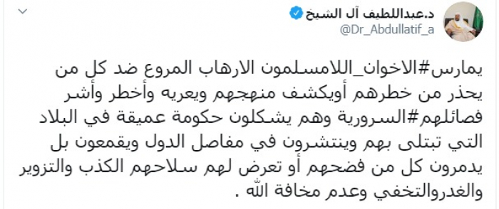 هاجم وزير الشؤون الإسلامية والدعوة والإرشاد السعودي، عبد اللطيف آل الشيخ، اليوم الإثنين، جماعة الإخوان الإرهابية.