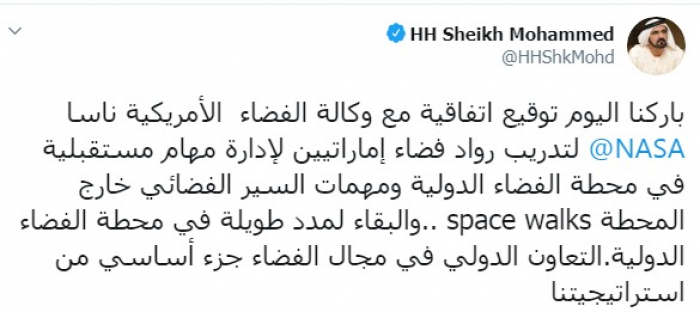 وكتب عبر تغريدة له على "تويتر" رصدها " المشهد العربي": "باركنا اليوم توقيع اتفاقية مع وكالة الفضاء الأمريكية ناسا لتدريب رواد فضاء إماراتيين لإدارة مهام مستقبلية في محطة الفضاء الدولية ومهمات السير الفضائي خارج المحطة space walks ..والبقاء لمدد طويلة في محطة الفضاء الدولية".
