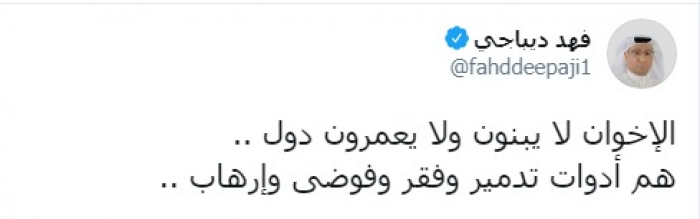 وكتب عبر تغريدة له على "تويتر" رصدها " المشهد العربي": "الإخوان لا يبنون ولا يعمرون دول، هم أدوات تدمير وفقر وفوضى وإرهاب".