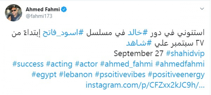 وكتب فهمي عبر حسابه الرسمي بموقع تويتر: "استنوني في دور خالد في مسلسل أسود فاتح، ابتداءًا من 27 سبتمبر على شاهد".