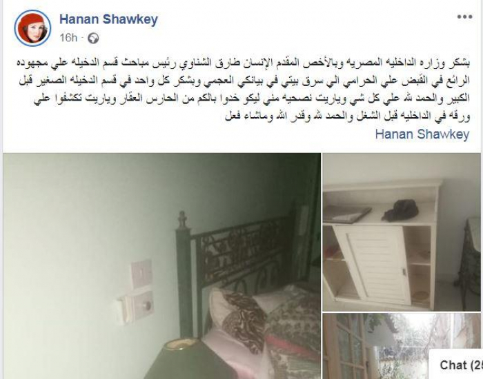 وكتبت حنان عبر حسابها الشخصي على موقع "فيسبوك"، تعليقًا على صور نشرتها من منزلها: "بشكر وزارة الداخلية المصرية، وبالأخص المقدم الإنسان طارق الشناوي رئيس مباحث قسم الدخيلة، على مجهوده الرائع في القبض على الحرامي اللي سرق بيتي في بيانكي العجمي".