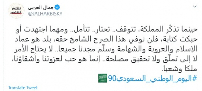 وكتب في تغريدة عبر "تويتر" رصدها "المشهد العربي": "حينما تذكُر المملكة، تتوقف.. تحتار.. تتأمل.. ومهما اجتهدت أو حبكت كتابة، فلن نوفي هذا الصرح الشامخ حقه، بلد هو عماد الإسلام والعروبة والشهامة وسلّم مجدنا جميعا.. لا يحتاج الأمر لا إلى تملّق ولا تحقيق مصلحة.. إنما هو حب لعزوتنا وأشقاؤنا، ملكا وشعبا".