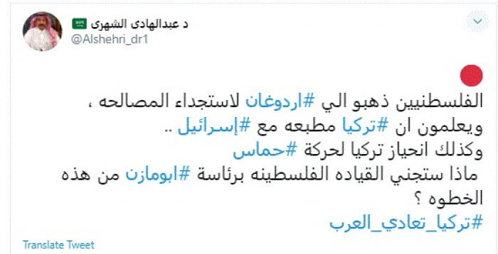 وقال في تغريدة عبر "تويتر" رصدها "المشهد العربي": "الفلسطنيين ذهبوا إلى أردوغان لاستجداء المصالحة، ويعلمون أن تركيا مطبعة مع إسرائيل.. وكذلك انحياز تركيا لحركة حماس ماذا ستجني القيادة الفلسطينية برئاسة أبومازن من هذه الخطوة؟".