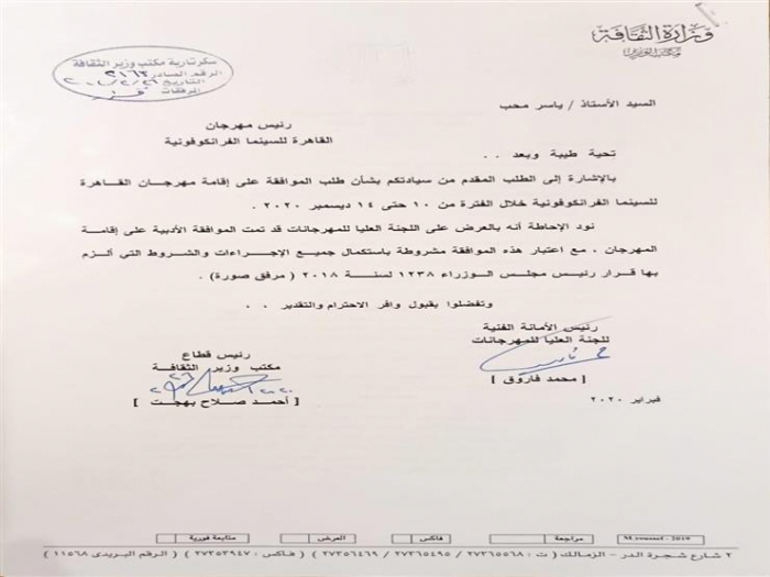 وأشاد ياسر محب بقرار عودة استئناف النشاط السينمائي متمثلاً في إقامة المهرجانات السينمائية والثقافية، لما لها من أهمية كبرى في تدعيم القوى الناعمة المصرية، كأحد دعائم الأمن القومي المصري، مضيفاً أن إدارة المهرجان قامت بالتواصل مع عدد من كبرى مهرجانات السينما بالدول الفرنكوفونية والأوروبية من أجل تبادل الخبرات فى مجال إقامة الفعاليات السينمائية والفنية بالهواء الطلق، وفق المعايير الدولية المحددة لتنظيم التظاهرات والأحداث الثقافية في مثل هذه الفترات من انتشار الأوبئة، وآليات تأمين العروض والنشاط السينمائي في عصر ما بعد كورونا، وذلك التزاماً من إدارة المهرجان بإتباع كافة الإجراءات الاحترازية واتخاذ جميع الاحتياطات اللازمة، التي أقرتها الدولة ومنظمة الصحة العالمية منذ بدء أزمة انتشار فيروس كورونا، لضمان سلامة المشاركين والضيوف والجمهور.