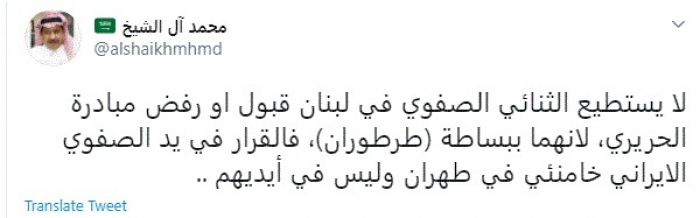 وكتب في تغريدة عبر "تويتر" رصدها "المشهد العربي": "لا يستطيع الثنائي الصفوي في لبنان قبول أو رفض مبادرة الحريري، لأنهما ببساطة (طرطوران)، فالقرار في يد الصفوي الإيراني خامنئي في طهران وليس في أيديهم".
