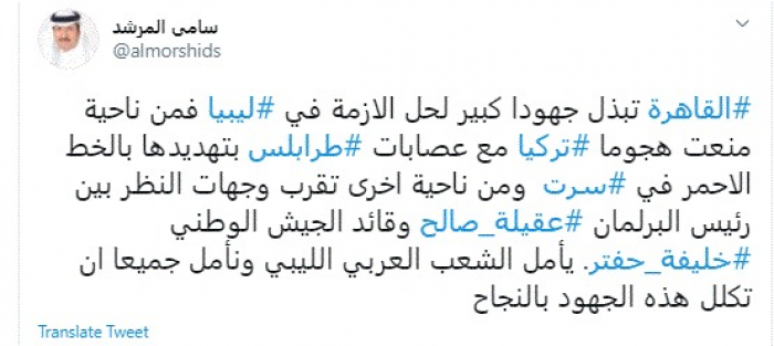 وقال في تغريدة عبر "تويتر" رصدها "المشهد العربي": "القاهرة تبذل جهودًا كبيرة لحل الأزمة في ليبيا فمن ناحية منعت هجوما تركيا مع عصابات طرابلس بتهديدها بالخط الأحمر في سرت".