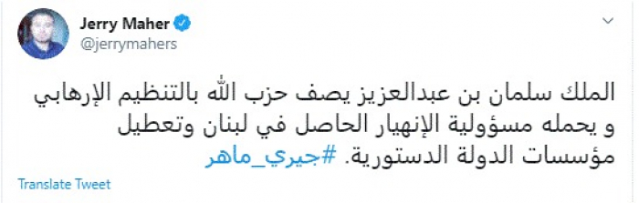 وكتب في تغريدة عبر "تويتر" رصدها "المشهد العربي": "الملك سلمان بن عبدالعزيز يصف حزب الله بالتنظيم الإرهابي و يحمله مسؤولية الإنهيار الحاصل في لبنان وتعطيل مؤسسات الدولة الدستورية".