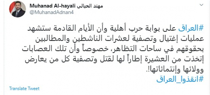 وقال في تغريدة عبر "تويتر" رصدها "المشهد العربي": "العراق على بوابة حرب أهلية وأن الأيام القادمة ستشهد عمليات إغتيال وتصفية لعشرات الناشطين والمطالبين بحقوقهم في ساحات التظاهر، خصوصاً وأن تلك العصابات إتخذت من العشيرة إطاراً لها لقتل وتصفية كل من يعارض وولائها وانتمائاتها".