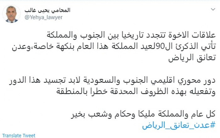 وكتب في تغريدة عبر "تويتر" رصدها "المشهد العربي": "علاقات الأخوة تتجدد تاريخيًا بين الجنوب والمملكة تأتي الذكرئ الـ90 لعيد المملكة هذا العام بنكهة خاصة".