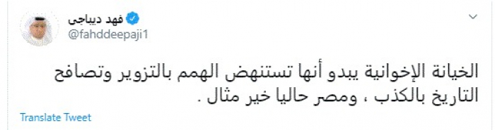 وقال في تغريدة عبر "تويتر" رصدها "المشهد العربي": "الخيانة الإخوانية يبدو أنها تستنهض الهمم بالتزوير وتصافح التاريخ بالكذب، ومصر حاليا خير مثال".