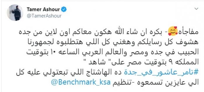 وكتب عاشور، عبر حسابه على تويتر، قائلاً: "مفاجأة.. بكرة إن شاء الله، هكون معاكم أون لاين من جدة، هشوف كل رسايلكم وهغني كل اللي هتطلبوه لجمهورنا الحبيب في جدة ومصر والعالم العربي الساعة ١٠ بتوقيت المملكة ٩ بتوقيت مصر على"شاهد ".