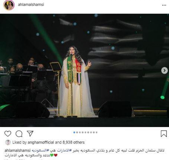 ونشرت أحلام، صورًا جديدة لها من الحفل، عبر حسابها على إنستجرام، وعلقت: "كل عام وبلادي السعودية بخير.. الإمارات هي السعودية والسعودية هي الإمارات".