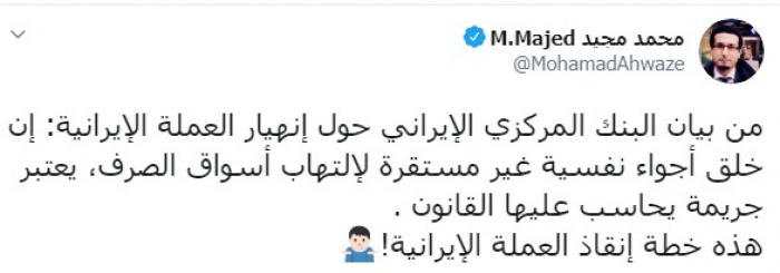وكتب عبر تغريدة له على "تويتر" رصدها " المشهد العربي": "من بيان البنك المركزي الإيراني حول انهيار العملة الإيرانية: إن خلق أجواء نفسية غير مستقرة لالتهاب أسواق الصرف، يعتبر جريمة يحاسب عليها القانون".