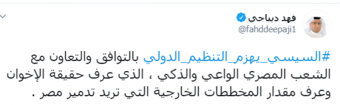 وكتب عبر تغريدة له على "تويتر" رصدها " المشهد العربي": "السيسي يهزم التنظيم الدولي بالتوافق والتعاون مع الشعب المصري الواعي والذكي، الذي عرف حقيقة الإخوان وعرف مقدار المخططات الخارجية التي تريد تدمير مصر".