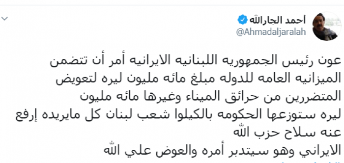 وكتب عبر تغريدة له على "تويتر" رصدها " المشهد العربي": "عون رئيس الجمهورية اللبنانية الإيرانية أمر أن تتضمن الميزانية العامة للدولة مبلغ مائة مليون ليرة لتعويض المتضررين من حرائق الميناء وغيرها، مائه مليون ليرة ستوزعها الحكومة بالكيلو، شعب لبنان كل ما يريده ارفع عنه سلاح حزب الله الإيراني وهو سيتدبر أمره والعوض على الله"