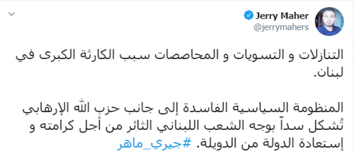 وكتب عبر تغريدة له على "تويتر" رصدها " المشهد العربي": "التنازلات و التسويات و المحاصصات سبب الكارثة الكبرى في لبنان، المنظومة السياسية الفاسدة إلى جانب حزب الله الإرهابي تُشكل سداً بوجه الشعب اللبناني الثائر من أجل كرامته و استعادة الدولة من الدويلة".